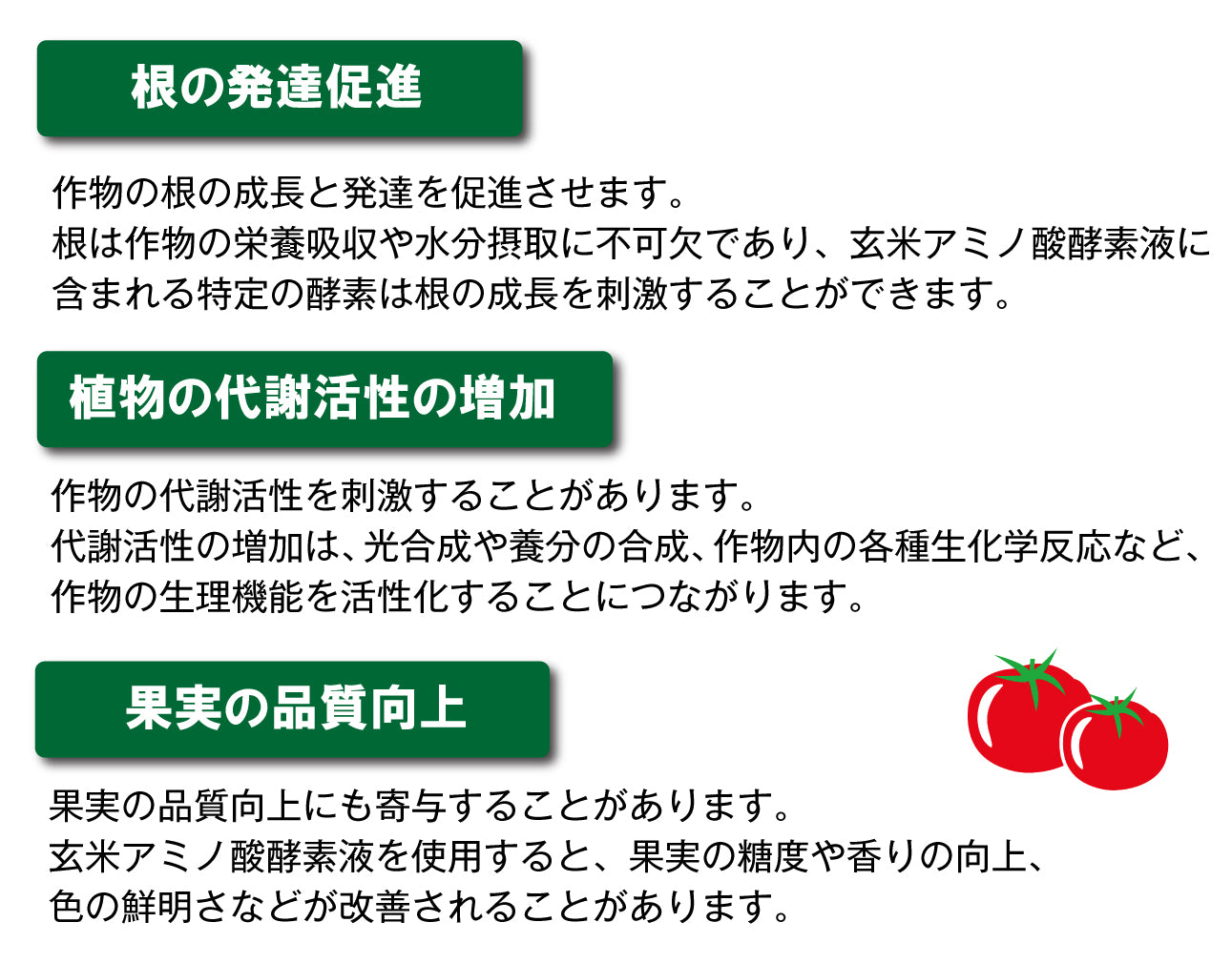 元気が出るのはいいが葉だけ大きくならないかと心配されるかもしれません。玄米アミノ酸 液体はチッソ分ではないのでその心配はいりません。基本的に玄米アミノ酸 液体を散布するだけで効果が得られます。